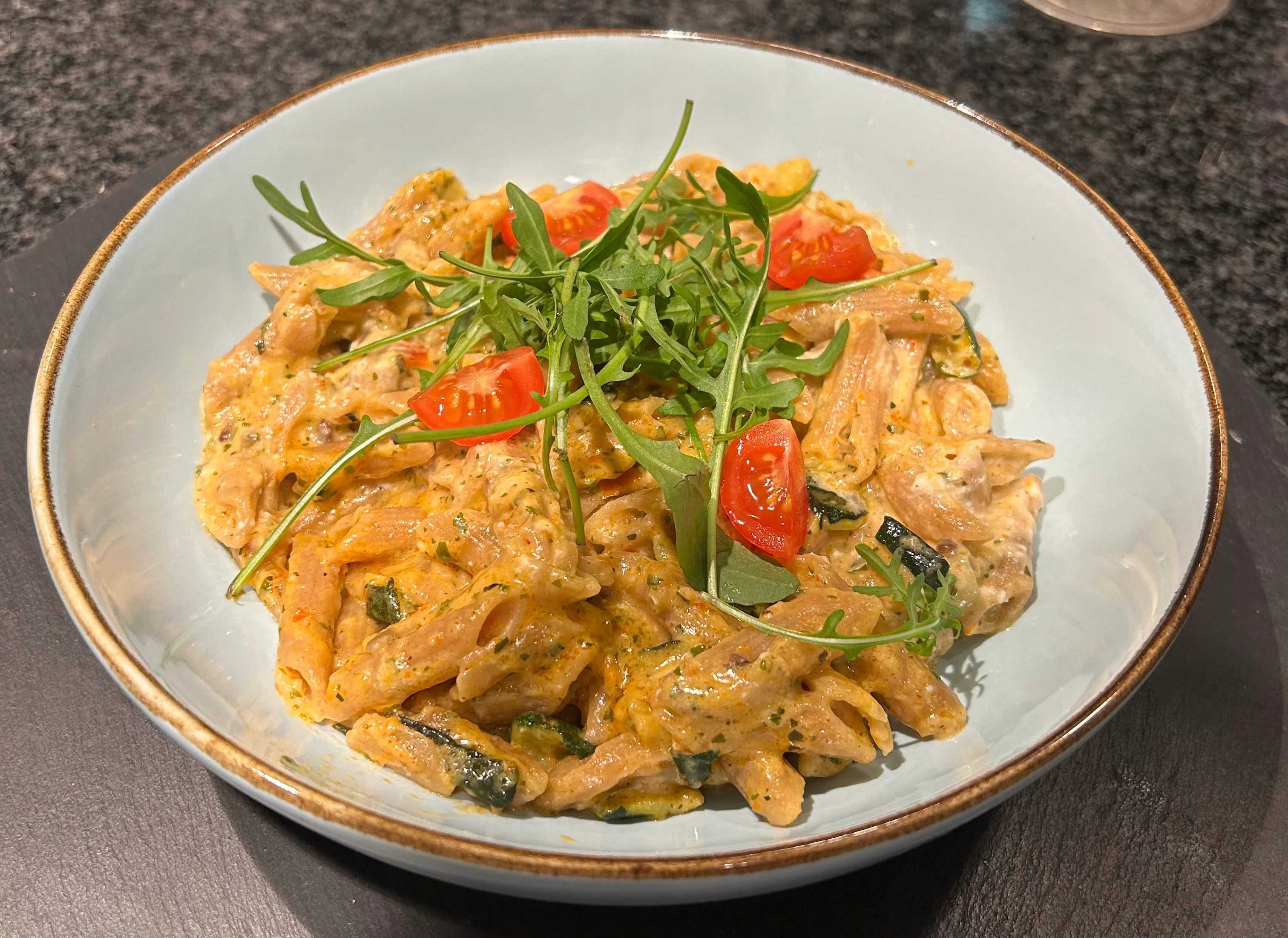 Vollkornpenne mit Feta, Gemüse & rotem Pesto